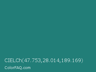 CIELCh 47.753,28.014,189.169 Color is a normal cyan color and the nearest color is Elm #1c7c7d. Hex code #217e78 and RGB value is rgb(33,126,120). In RGB color space, this color is composed of 13% red, 49% green, 47% blue, In CMYK color space, this color is composed of 74% cyan, 0% magenta, 5% yellow , 51% black , In HSL color space, this color has a hue angle of 176° , 58% saturation and 31% lightness.