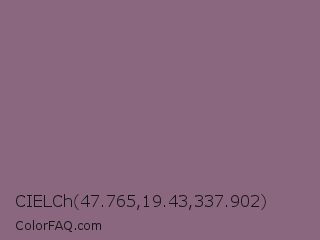 CIELCh 47.765,19.43,337.902 Color is a normal magenta color and the nearest color is Chinese Violet #856088. Hex code #8a677e and RGB value is rgb(138,103,126). In RGB color space, this color is composed of 54% red, 40% green, 49% blue, In CMYK color space, this color is composed of 0% cyan, 25% magenta, 9% yellow , 46% black , In HSL color space, this color has a hue angle of 321° , 15% saturation and 47% lightness.