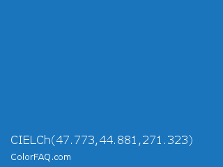 CIELCh 47.773,44.881,271.323 Color is a normal blue color and the nearest color is Bright Navy Blue #1974d2. Hex code #1a75bd and RGB value is rgb(26,117,189). In RGB color space, this color is composed of 10% red, 46% green, 74% blue, In CMYK color space, this color is composed of 86% cyan, 38% magenta, 0% yellow , 26% black , In HSL color space, this color has a hue angle of 207° , 76% saturation and 42% lightness.