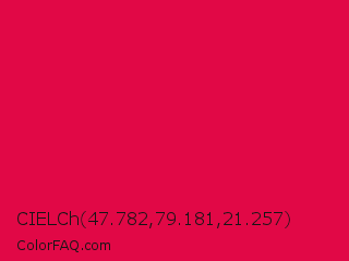 CIELCh 47.782,79.181,21.257 Color is a normal rose color and the nearest color is UA Red #d9004c. Hex code #e10846 and RGB value is rgb(225,8,70). In RGB color space, this color is composed of 88% red, 3% green, 27% blue, In CMYK color space, this color is composed of 0% cyan, 96% magenta, 69% yellow , 12% black , In HSL color space, this color has a hue angle of 343° , 93% saturation and 46% lightness.