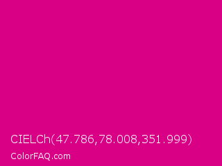 CIELCh 47.786,78.008,351.999 Color is a normal magenta color and the nearest color is Mexican Pink #e4007c. Hex code #da0086 and RGB value is rgb(218,0,134). In RGB color space, this color is composed of 85% red, 0% green, 53% blue, In CMYK color space, this color is composed of 0% cyan, 100% magenta, 39% yellow , 15% black , In HSL color space, this color has a hue angle of 323° , 100% saturation and 43% lightness.