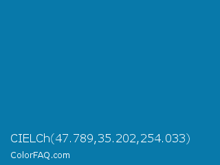 CIELCh 47.789,35.202,254.033 Color is a normal blue color and the nearest color is Deep Cerulean #007ba7. Hex code #0879aa and RGB value is rgb(8,121,170). In RGB color space, this color is composed of 3% red, 47% green, 67% blue, In CMYK color space, this color is composed of 95% cyan, 29% magenta, 0% yellow , 33% black , In HSL color space, this color has a hue angle of 198° , 91% saturation and 35% lightness.