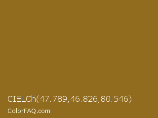CIELCh 47.789,46.826,80.546 Color is a normal orange color and the nearest color is Sand Dune #967117. Hex code #916b1e and RGB value is rgb(145,107,30). In RGB color space, this color is composed of 57% red, 42% green, 12% blue, In CMYK color space, this color is composed of 0% cyan, 26% magenta, 79% yellow , 43% black , In HSL color space, this color has a hue angle of 40° , 66% saturation and 34% lightness.