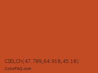 CIELCh 47.789,64.918,45.18 Color is a normal color and the nearest color is Dark Pastel Red #c23b22. Hex code #c24b24 and RGB value is rgb(194,75,36). In RGB color space, this color is composed of 76% red, 29% green, 14% blue, In CMYK color space, this color is composed of 0% cyan, 61% magenta, 81% yellow , 24% black , In HSL color space, this color has a hue angle of 15° , 69% saturation and 45% lightness.