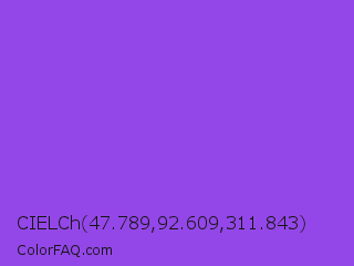 CIELCh 47.789,92.609,311.843 Color is a normal violet color and the nearest color is Navy Purple #9457eb. Hex code #9447e8 and RGB value is rgb(148,71,232). In RGB color space, this color is composed of 58% red, 28% green, 91% blue, In CMYK color space, this color is composed of 36% cyan, 69% magenta, 0% yellow , 9% black , In HSL color space, this color has a hue angle of 269° , 78% saturation and 59% lightness.