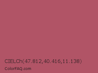 CIELCh 47.812,40.416,11.138 Color is a normal red color and the nearest color is Cadillac #b04c6a. Hex code #b15466 and RGB value is rgb(177,84,102). In RGB color space, this color is composed of 69% red, 33% green, 40% blue, In CMYK color space, this color is composed of 0% cyan, 53% magenta, 42% yellow , 31% black , In HSL color space, this color has a hue angle of 348° , 37% saturation and 51% lightness.