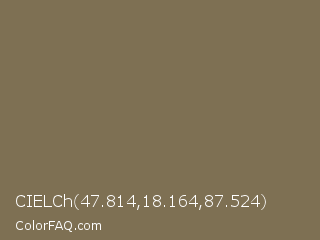 CIELCh 47.814,18.164,87.524 Color is a normal orange color and the nearest color is Shadow Crayola #837050. Hex code #7e7053 and RGB value is rgb(126,112,83). In RGB color space, this color is composed of 49% red, 44% green, 33% blue, In CMYK color space, this color is composed of 0% cyan, 11% magenta, 34% yellow , 51% black , In HSL color space, this color has a hue angle of 40° , 21% saturation and 41% lightness.