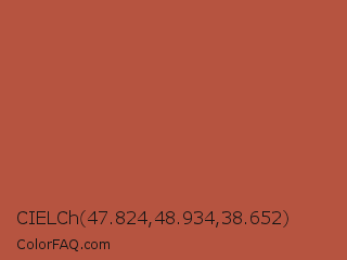 CIELCh 47.824,48.934,38.652 Color is a normal red color and the nearest color is Crail #b95140. Hex code #b65440 and RGB value is rgb(182,84,64). In RGB color space, this color is composed of 71% red, 33% green, 25% blue, In CMYK color space, this color is composed of 0% cyan, 54% magenta, 65% yellow , 29% black , In HSL color space, this color has a hue angle of 10° , 48% saturation and 48% lightness.