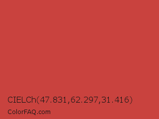 CIELCh 47.831,62.297,31.416 Color is a normal red color and the nearest color is Mojo #c04737. Hex code #c9423e and RGB value is rgb(201,66,62). In RGB color space, this color is composed of 79% red, 26% green, 24% blue, In CMYK color space, this color is composed of 0% cyan, 67% magenta, 69% yellow , 21% black , In HSL color space, this color has a hue angle of 2° , 56% saturation and 52% lightness.