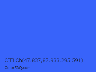 CIELCh 47.837,87.933,295.591 Color is a normal blue color and the nearest color is Ultramarine Blue #4166f5. Hex code #3863fa and RGB value is rgb(56,99,250). In RGB color space, this color is composed of 22% red, 39% green, 98% blue, In CMYK color space, this color is composed of 78% cyan, 60% magenta, 0% yellow , 2% black , In HSL color space, this color has a hue angle of 227° , 95% saturation and 60% lightness.