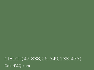CIELCh 47.838,26.649,138.456 Color is a normal green color and the nearest color is Cactus #587156. Hex code #597a53 and RGB value is rgb(89,122,83). In RGB color space, this color is composed of 35% red, 48% green, 33% blue, In CMYK color space, this color is composed of 27% cyan, 0% magenta, 32% yellow , 52% black , In HSL color space, this color has a hue angle of 111° , 19% saturation and 40% lightness.