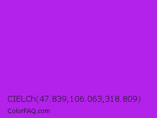 CIELCh 47.839,106.063,318.809 Color is a normal purple color and the nearest color is Veronica #a020f0. Hex code #b322ea and RGB value is rgb(179,34,234). In RGB color space, this color is composed of 70% red, 13% green, 92% blue, In CMYK color space, this color is composed of 24% cyan, 85% magenta, 0% yellow , 8% black , In HSL color space, this color has a hue angle of 284° , 83% saturation and 53% lightness.