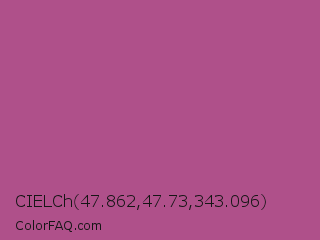 CIELCh 47.862,47.73,343.096 Color is a normal magenta color and the nearest color is Tapestry #b05e81. Hex code #af508a and RGB value is rgb(175,80,138). In RGB color space, this color is composed of 69% red, 31% green, 54% blue, In CMYK color space, this color is composed of 0% cyan, 54% magenta, 21% yellow , 31% black , In HSL color space, this color has a hue angle of 323° , 37% saturation and 50% lightness.
