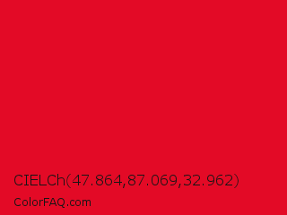 CIELCh 47.864,87.069,32.962 Color is a normal red color and the nearest color is Medium Candy Apple Red #e2062c. Hex code #e30a26 and RGB value is rgb(227,10,38). In RGB color space, this color is composed of 89% red, 4% green, 15% blue, In CMYK color space, this color is composed of 0% cyan, 96% magenta, 83% yellow , 11% black , In HSL color space, this color has a hue angle of 352° , 92% saturation and 46% lightness.