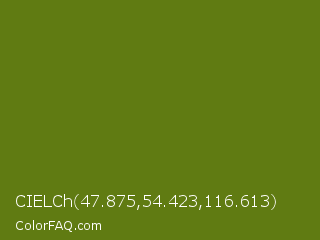 CIELCh 47.875,54.423,116.613 Color is a dark lime color and the nearest color is Fern Frond #657220. Hex code #607b12 and RGB value is rgb(96,123,18). In RGB color space, this color is composed of 38% red, 48% green, 7% blue, In CMYK color space, this color is composed of 22% cyan, 0% magenta, 85% yellow , 52% black , In HSL color space, this color has a hue angle of 75° , 74% saturation and 28% lightness.