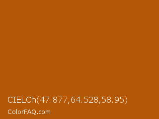 CIELCh 47.877,64.528,58.95 Color is a normal orange color and the nearest color is Pumpkin Skin #b1610b. Hex code #b45807 and RGB value is rgb(180,88,7). In RGB color space, this color is composed of 71% red, 35% green, 3% blue, In CMYK color space, this color is composed of 0% cyan, 51% magenta, 96% yellow , 29% black , In HSL color space, this color has a hue angle of 28° , 93% saturation and 37% lightness.