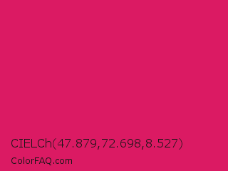 CIELCh 47.879,72.698,8.527 Color is a normal rose color and the nearest color is Dogwood Rose #d71868. Hex code #db1a63 and RGB value is rgb(219,26,99). In RGB color space, this color is composed of 86% red, 10% green, 39% blue, In CMYK color space, this color is composed of 0% cyan, 88% magenta, 55% yellow , 14% black , In HSL color space, this color has a hue angle of 337° , 79% saturation and 48% lightness.