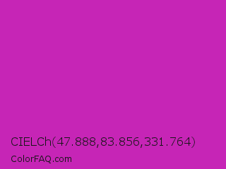 CIELCh 47.888,83.856,331.764 Color is a normal magenta color and the nearest color is Byzantine #bd33a4. Hex code #c625b6 and RGB value is rgb(198,37,182). In RGB color space, this color is composed of 78% red, 15% green, 71% blue, In CMYK color space, this color is composed of 0% cyan, 81% magenta, 8% yellow , 22% black , In HSL color space, this color has a hue angle of 306° , 69% saturation and 46% lightness.