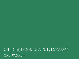 CIELCh 47.895,37.201,158.924 Color is a normal green color and the nearest color is Eucalyptus #278a5b. Hex code #2c805a and RGB value is rgb(44,128,90). In RGB color space, this color is composed of 17% red, 50% green, 35% blue, In CMYK color space, this color is composed of 66% cyan, 0% magenta, 30% yellow , 50% black , In HSL color space, this color has a hue angle of 153° , 49% saturation and 34% lightness.