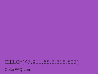 CIELCh 47.911,68.3,318.503 Color is a normal purple color and the nearest color is Deep Lilac #9955bb. Hex code #9f4fbf and RGB value is rgb(159,79,191). In RGB color space, this color is composed of 62% red, 31% green, 75% blue, In CMYK color space, this color is composed of 17% cyan, 59% magenta, 0% yellow , 25% black , In HSL color space, this color has a hue angle of 283° , 47% saturation and 53% lightness.