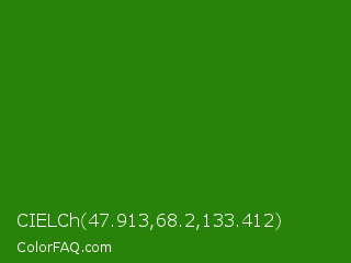 CIELCh 47.913,68.2,133.412 Color is a dark green color and the nearest color is Napier Green #2a8000. Hex code #29830a and RGB value is rgb(41,131,10). In RGB color space, this color is composed of 16% red, 51% green, 4% blue, In CMYK color space, this color is composed of 69% cyan, 0% magenta, 92% yellow , 49% black , In HSL color space, this color has a hue angle of 105° , 86% saturation and 28% lightness.