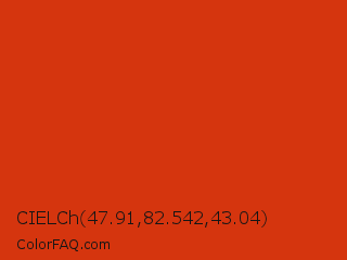 CIELCh 47.91,82.542,43.04 Color is a normal red color and the nearest color is Sinopia #cb410b. Hex code #d5350e and RGB value is rgb(213,53,14). In RGB color space, this color is composed of 84% red, 21% green, 5% blue, In CMYK color space, this color is composed of 0% cyan, 75% magenta, 93% yellow , 16% black , In HSL color space, this color has a hue angle of 12° , 88% saturation and 45% lightness.