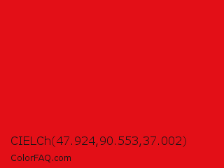 CIELCh 47.924,90.553,37.002 Color is a normal red color and the nearest color is Cadmium Red #e30022. Hex code #e30f17 and RGB value is rgb(227,15,23). In RGB color space, this color is composed of 89% red, 6% green, 9% blue, In CMYK color space, this color is composed of 0% cyan, 93% magenta, 90% yellow , 11% black , In HSL color space, this color has a hue angle of 358° , 88% saturation and 47% lightness.