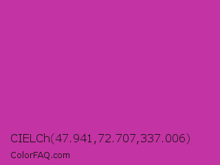CIELCh 47.941,72.707,337.006 Color is a normal magenta color and the nearest color is Byzantine #bd33a4. Hex code #c433a3 and RGB value is rgb(196,51,163). In RGB color space, this color is composed of 77% red, 20% green, 64% blue, In CMYK color space, this color is composed of 0% cyan, 74% magenta, 17% yellow , 23% black , In HSL color space, this color has a hue angle of 314° , 59% saturation and 48% lightness.