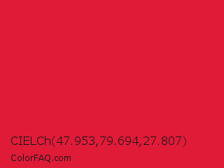 CIELCh 47.953,79.694,27.807 Color is a normal red color and the nearest color is Crimson #dc143c. Hex code #df1b38 and RGB value is rgb(223,27,56). In RGB color space, this color is composed of 87% red, 11% green, 22% blue, In CMYK color space, this color is composed of 0% cyan, 88% magenta, 75% yellow , 13% black , In HSL color space, this color has a hue angle of 351° , 78% saturation and 49% lightness.