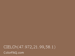 CIELCh 47.972,21.99,58.1 Color is a normal orange color and the nearest color is Beaver Crayola #926f5b. Hex code #8f6a53 and RGB value is rgb(143,106,83). In RGB color space, this color is composed of 56% red, 42% green, 33% blue, In CMYK color space, this color is composed of 0% cyan, 26% magenta, 42% yellow , 44% black , In HSL color space, this color has a hue angle of 23° , 27% saturation and 44% lightness.