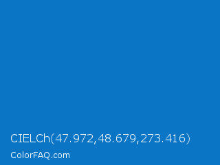 CIELCh 47.972,48.679,273.416 Color is a normal blue color and the nearest color is Ocean Boat Blue #0077be. Hex code #0a75c4 and RGB value is rgb(10,117,196). In RGB color space, this color is composed of 4% red, 46% green, 77% blue, In CMYK color space, this color is composed of 95% cyan, 40% magenta, 0% yellow , 23% black , In HSL color space, this color has a hue angle of 205° , 90% saturation and 40% lightness.
