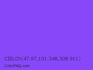CIELCh 47.97,101.348,308.911 Color is a light violet color and the nearest color is Navy Purple #9457eb. Hex code #8848fa and RGB value is rgb(136,72,250). In RGB color space, this color is composed of 53% red, 28% green, 98% blue, In CMYK color space, this color is composed of 46% cyan, 71% magenta, 0% yellow , 2% black , In HSL color space, this color has a hue angle of 262° , 95% saturation and 63% lightness.
