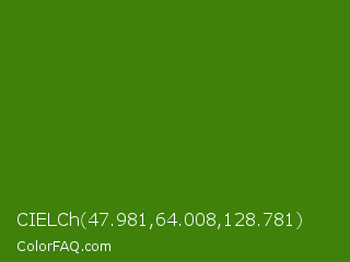 CIELCh 47.981,64.008,128.781 Color is a dark green color and the nearest color is La Palma #368716. Hex code #3f810a and RGB value is rgb(63,129,10). In RGB color space, this color is composed of 25% red, 51% green, 4% blue, In CMYK color space, this color is composed of 51% cyan, 0% magenta, 92% yellow , 49% black , In HSL color space, this color has a hue angle of 93° , 86% saturation and 27% lightness.