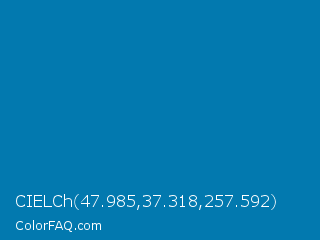 CIELCh 47.985,37.318,257.592 Color is a normal blue color and the nearest color is Deep Cerulean #007ba7. Hex code #0279af and RGB value is rgb(2,121,175). In RGB color space, this color is composed of 1% red, 47% green, 69% blue, In CMYK color space, this color is composed of 99% cyan, 31% magenta, 0% yellow , 31% black , In HSL color space, this color has a hue angle of 199° , 98% saturation and 35% lightness.