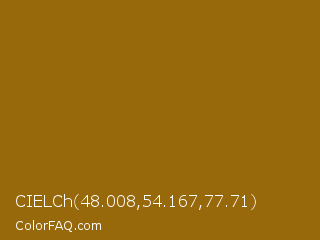 CIELCh 48.008,54.167,77.71 Color is a normal orange color and the nearest color is Gamboge Orange Brown #996600. Hex code #98690a and RGB value is rgb(152,105,10). In RGB color space, this color is composed of 60% red, 41% green, 4% blue, In CMYK color space, this color is composed of 0% cyan, 31% magenta, 93% yellow , 40% black , In HSL color space, this color has a hue angle of 40° , 88% saturation and 32% lightness.