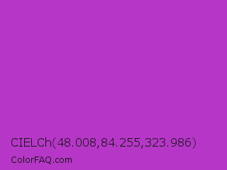 CIELCh 48.008,84.255,323.986 Color is a normal magenta color and the nearest color is Steel Pink #cc33cc. Hex code #b637c7 and RGB value is rgb(182,55,199). In RGB color space, this color is composed of 71% red, 22% green, 78% blue, In CMYK color space, this color is composed of 9% cyan, 72% magenta, 0% yellow , 22% black , In HSL color space, this color has a hue angle of 293° , 57% saturation and 50% lightness.