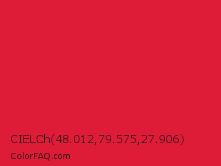 CIELCh 48.012,79.575,27.906 Color is a normal red color and the nearest color is Crimson #dc143c. Hex code #df1c38 and RGB value is rgb(223,28,56). In RGB color space, this color is composed of 87% red, 11% green, 22% blue, In CMYK color space, this color is composed of 0% cyan, 87% magenta, 75% yellow , 13% black , In HSL color space, this color has a hue angle of 351° , 78% saturation and 49% lightness.