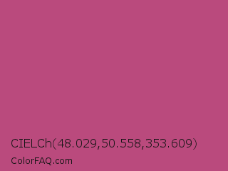 CIELCh 48.029,50.558,353.609 Color is a normal rose color and the nearest color is Mystic Maroon #ad4379. Hex code #ba4a7d and RGB value is rgb(186,74,125). In RGB color space, this color is composed of 73% red, 29% green, 49% blue, In CMYK color space, this color is composed of 0% cyan, 60% magenta, 33% yellow , 27% black , In HSL color space, this color has a hue angle of 333° , 45% saturation and 51% lightness.