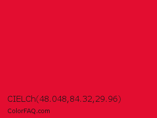 CIELCh 48.048,84.32,29.96 Color is a normal red color and the nearest color is Medium Candy Apple Red #e2062c. Hex code #e30d30 and RGB value is rgb(227,13,48). In RGB color space, this color is composed of 89% red, 5% green, 19% blue, In CMYK color space, this color is composed of 0% cyan, 94% magenta, 79% yellow , 11% black , In HSL color space, this color has a hue angle of 350° , 89% saturation and 47% lightness.