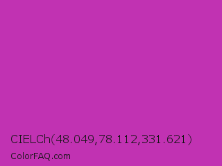 CIELCh 48.049,78.112,331.621 Color is a normal magenta color and the nearest color is Byzantine #bd33a4. Hex code #c132b2 and RGB value is rgb(193,50,178). In RGB color space, this color is composed of 76% red, 20% green, 70% blue, In CMYK color space, this color is composed of 0% cyan, 74% magenta, 8% yellow , 24% black , In HSL color space, this color has a hue angle of 306° , 59% saturation and 48% lightness.