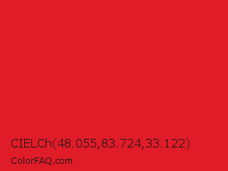 CIELCh 48.055,83.724,33.122 Color is a normal red color and the nearest color is Lust #e62020. Hex code #e01c29 and RGB value is rgb(224,28,41). In RGB color space, this color is composed of 88% red, 11% green, 16% blue, In CMYK color space, this color is composed of 0% cyan, 88% magenta, 82% yellow , 12% black , In HSL color space, this color has a hue angle of 356° , 78% saturation and 49% lightness.