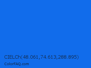CIELCh 48.061,74.613,288.895 Color is a normal blue color and the nearest color is Blue Crayola #1f75fe. Hex code #116ceb and RGB value is rgb(17,108,235). In RGB color space, this color is composed of 7% red, 42% green, 92% blue, In CMYK color space, this color is composed of 93% cyan, 54% magenta, 0% yellow , 8% black , In HSL color space, this color has a hue angle of 215° , 87% saturation and 49% lightness.