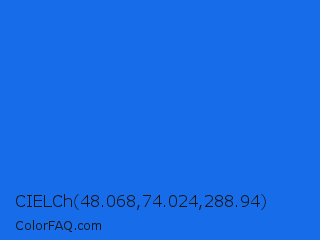 CIELCh 48.068,74.024,288.94 Color is a normal blue color and the nearest color is Blue Crayola #1f75fe. Hex code #176cea and RGB value is rgb(23,108,234). In RGB color space, this color is composed of 9% red, 42% green, 92% blue, In CMYK color space, this color is composed of 90% cyan, 54% magenta, 0% yellow , 8% black , In HSL color space, this color has a hue angle of 216° , 83% saturation and 50% lightness.