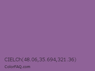 CIELCh 48.06,35.694,321.36 Color is a normal purple color and the nearest color is Trendy Pink #8c6495. Hex code #8f6298 and RGB value is rgb(143,98,152). In RGB color space, this color is composed of 56% red, 38% green, 60% blue, In CMYK color space, this color is composed of 6% cyan, 36% magenta, 0% yellow , 40% black , In HSL color space, this color has a hue angle of 290° , 22% saturation and 49% lightness.