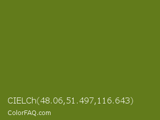 CIELCh 48.06,51.497,116.643 Color is a dark lime color and the nearest color is Fern Frond #657220. Hex code #627b1b and RGB value is rgb(98,123,27). In RGB color space, this color is composed of 38% red, 48% green, 11% blue, In CMYK color space, this color is composed of 20% cyan, 0% magenta, 78% yellow , 52% black , In HSL color space, this color has a hue angle of 76° , 64% saturation and 29% lightness.