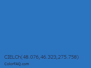 CIELCh 48.076,46.323,275.758 Color is a normal blue color and the nearest color is Mariner #286acd. Hex code #2d74c0 and RGB value is rgb(45,116,192). In RGB color space, this color is composed of 18% red, 45% green, 75% blue, In CMYK color space, this color is composed of 77% cyan, 40% magenta, 0% yellow , 25% black , In HSL color space, this color has a hue angle of 211° , 62% saturation and 46% lightness.