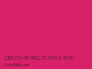 CIELCh 48.082,70.939,5.918 Color is a normal rose color and the nearest color is Dogwood Rose #d71868. Hex code #d92169 and RGB value is rgb(217,33,105). In RGB color space, this color is composed of 85% red, 13% green, 41% blue, In CMYK color space, this color is composed of 0% cyan, 85% magenta, 52% yellow , 15% black , In HSL color space, this color has a hue angle of 337° , 74% saturation and 49% lightness.