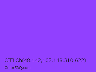 CIELCh 48.142,107.148,310.622 Color is a light violet color and the nearest color is Navy Purple #9457eb. Hex code #9140ff and RGB value is rgb(145,64,255). In RGB color space, this color is composed of 57% red, 25% green, 100% blue, In CMYK color space, this color is composed of 43% cyan, 75% magenta, 0% yellow , 0% black , In HSL color space, this color has a hue angle of 265° , 100% saturation and 63% lightness.