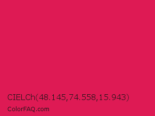 CIELCh 48.145,74.558,15.943 Color is a normal rose color and the nearest color is Spanish Crimson #e51a4c. Hex code #de1a54 and RGB value is rgb(222,26,84). In RGB color space, this color is composed of 87% red, 10% green, 33% blue, In CMYK color space, this color is composed of 0% cyan, 88% magenta, 62% yellow , 13% black , In HSL color space, this color has a hue angle of 342° , 79% saturation and 49% lightness.