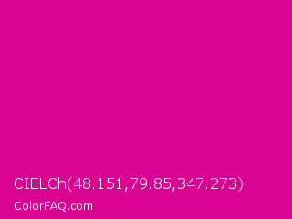 CIELCh 48.151,79.85,347.273 Color is a normal magenta color and the nearest color is Mexican Pink #e4007c. Hex code #d90492 and RGB value is rgb(217,4,146). In RGB color space, this color is composed of 85% red, 2% green, 57% blue, In CMYK color space, this color is composed of 0% cyan, 98% magenta, 33% yellow , 15% black , In HSL color space, this color has a hue angle of 320° , 96% saturation and 43% lightness.